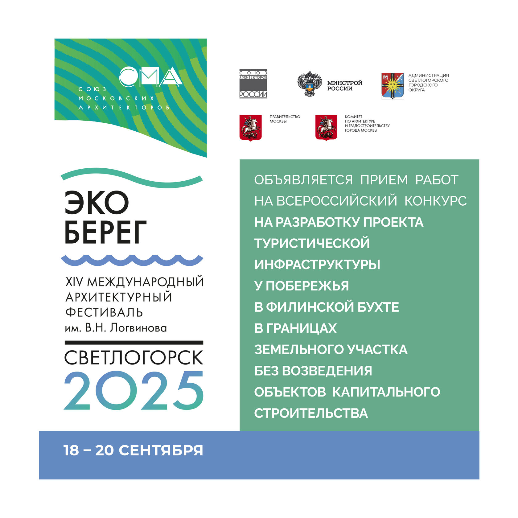 XIV Международный архитектурный фестиваль имени В.Н. Логвинова «ЭкоБерег» пройдёт с 18 по 20 сентября в Калининградской области на берегу Балтийского моря в городе‑курорте Светлогорске.